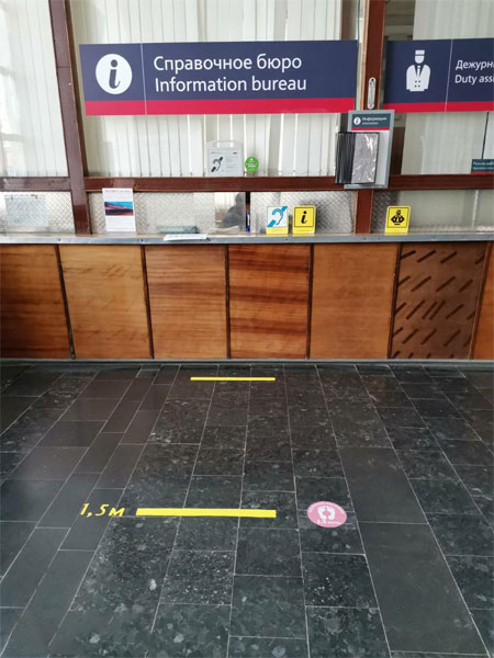 В кассовых залах, у информационных табло и информационно-справочных стоек, на входном контроле и в переходах нанесена специальная разметка (информационные полосы с интервалом в 1,5 м).