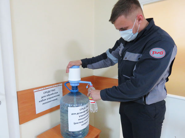 Добротно оснащены члены локомотивных бригад и средствами индивидуальной защиты. С 15 апреля машинистам и помощникам машинистов грузового движения выдаются перед отправкой в рейс по две пары резиновых перчаток и по четыре одноразовых маски. В маневровом и хозяйственном движении машинисты получают по 3 одноразовых маски и по 1 паре перчаток. Бригады, отправляющиеся в рейс, получают на специальном посту дезинфицирующий раствор (гипохлорит натрия) для предрейсовой обработки кабин