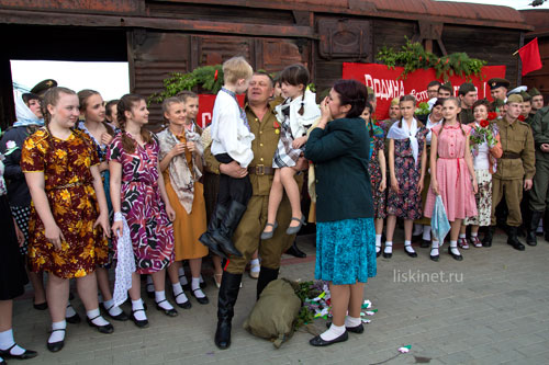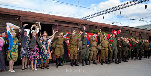 На перроне под звуки духового оркестра развернулось театрализованное представление лискинских артистов - стилизованная реконструкция событий мая 1945 года.