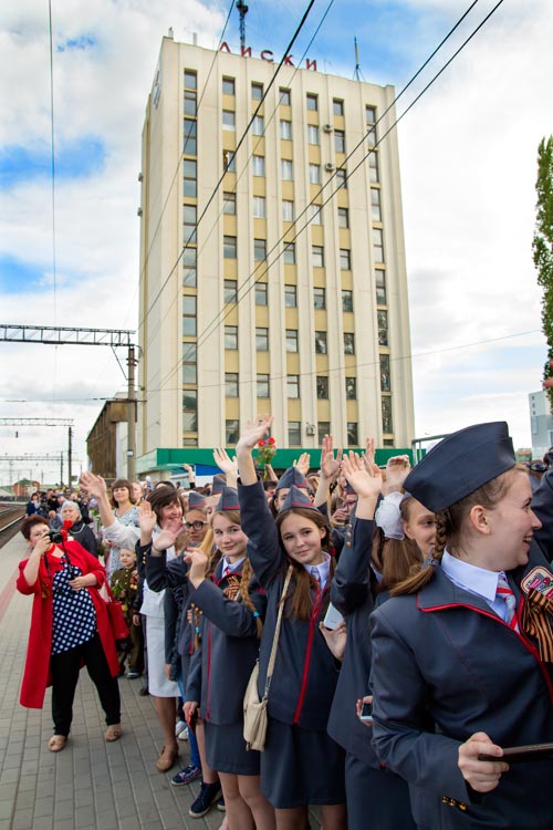 8 мая на станцию Лиски прибыл ретро-поезд в составе праздничного эшелона - паровоза с двумя вагонами-теплушками.